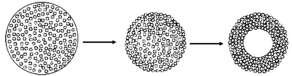 噴霧干燥法是制備噴涂涂層用原料的重要方法,通過(guò)使用適當(dāng)?shù)挠袡C(jī)黏合劑聚集不同的小顆粒進(jìn)而從漿料中經(jīng)干燥獲取顆粒團(tuán)聚體。漿料在干燥過(guò)程中發(fā)生快速傳熱和傳質(zhì),根據(jù)操作參數(shù)、漿料特性的不同,得到諸如空心、致密、多孔等形態(tài)各異的球形或其他形狀的顆粒團(tuán)聚體[32,33]。噴霧造粒得到不同結(jié)構(gòu)的團(tuán)聚顆粒如圖2[32]所示。漿料在噴霧干燥過(guò)程霧化為球形液滴后的快速干燥階段,液滴中的水分快速蒸發(fā)產(chǎn)生毛細(xì)管力,進(jìn)而液滴內(nèi)部的細(xì)小顆粒在毛細(xì)管力的作用下向表面遷移并最終形成空心顆粒,如圖3[34]所示。因此,在噴霧干燥過(guò)程中,漿料的分散性是決定團(tuán)聚顆粒結(jié)構(gòu)的關(guān)鍵因素,高分散性漿料中細(xì)小顆粒的遷移阻力更小,更有助于獲取具有空心結(jié)構(gòu)的顆粒團(tuán)聚體。