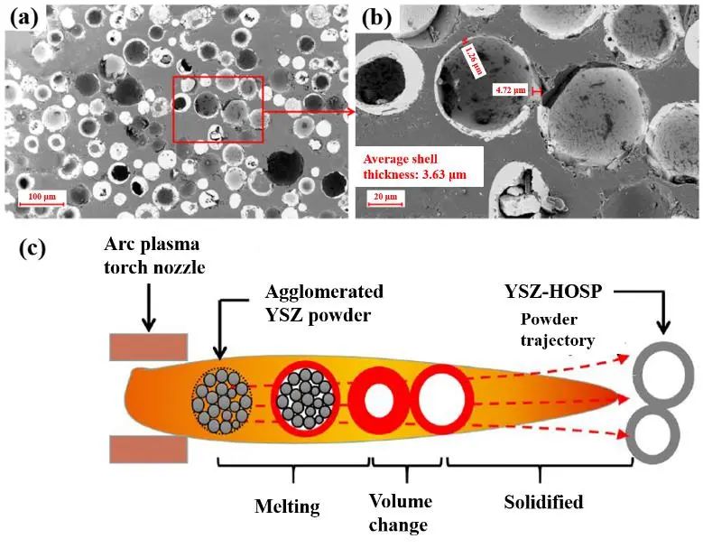Qiu等[52]以中位徑46.43 μm且空心比例不足10%的YSZ粉末為原料,采用三陰極等離子體炬燒結(jié)制備得到了球化率接近100%、顆粒中位徑52.38 μm、空心顆粒比例93.4%且平均壁厚僅為3.63 μm的四方相YSZ粉末,合成的空心微球及顆粒的空心化過(guò)程如圖5所示。