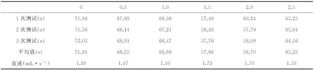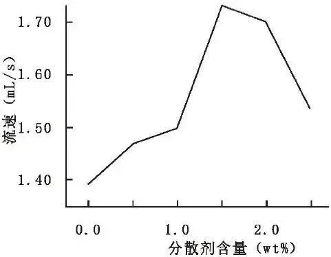 以50%固相含量,低粘度3YSZ漿料為基礎(chǔ),配制100mL漿料,添加分散劑含量分別為0.5%、1%、1.5%、2%和2.5%,讓漿料通過相同的自制容器,通過考察漿料的流速來反應(yīng)漿料的粘度。實(shí)驗(yàn)結(jié)果如表3和圖1所示。