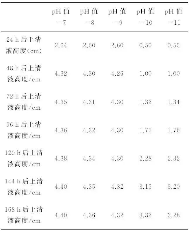 利用氨水將固相含量約為1%的3YSZ漿料的pH值調(diào)節(jié)至7~11,液面高度為7cm,靜置不同的時(shí)間,分 別測(cè)定上層清液的高度,實(shí)驗(yàn)結(jié)果如表2所示。表2 不同pH值時(shí)上清液高度隨時(shí)間變化表